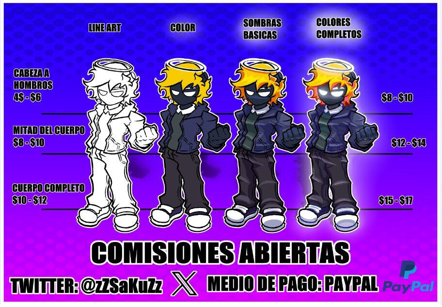 ¡Hola, qué tal! Aquí tienes mi hoja de comisiones. Puedes revisar la parte inferior para ver el precio total por un solo personaje. Y si buscas algo más sencillo o económico, hay dos opciones más arriba.